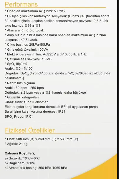 Oksijen Saflık Değeri: %90 ± 3 (5 L/dk’ya kadar)