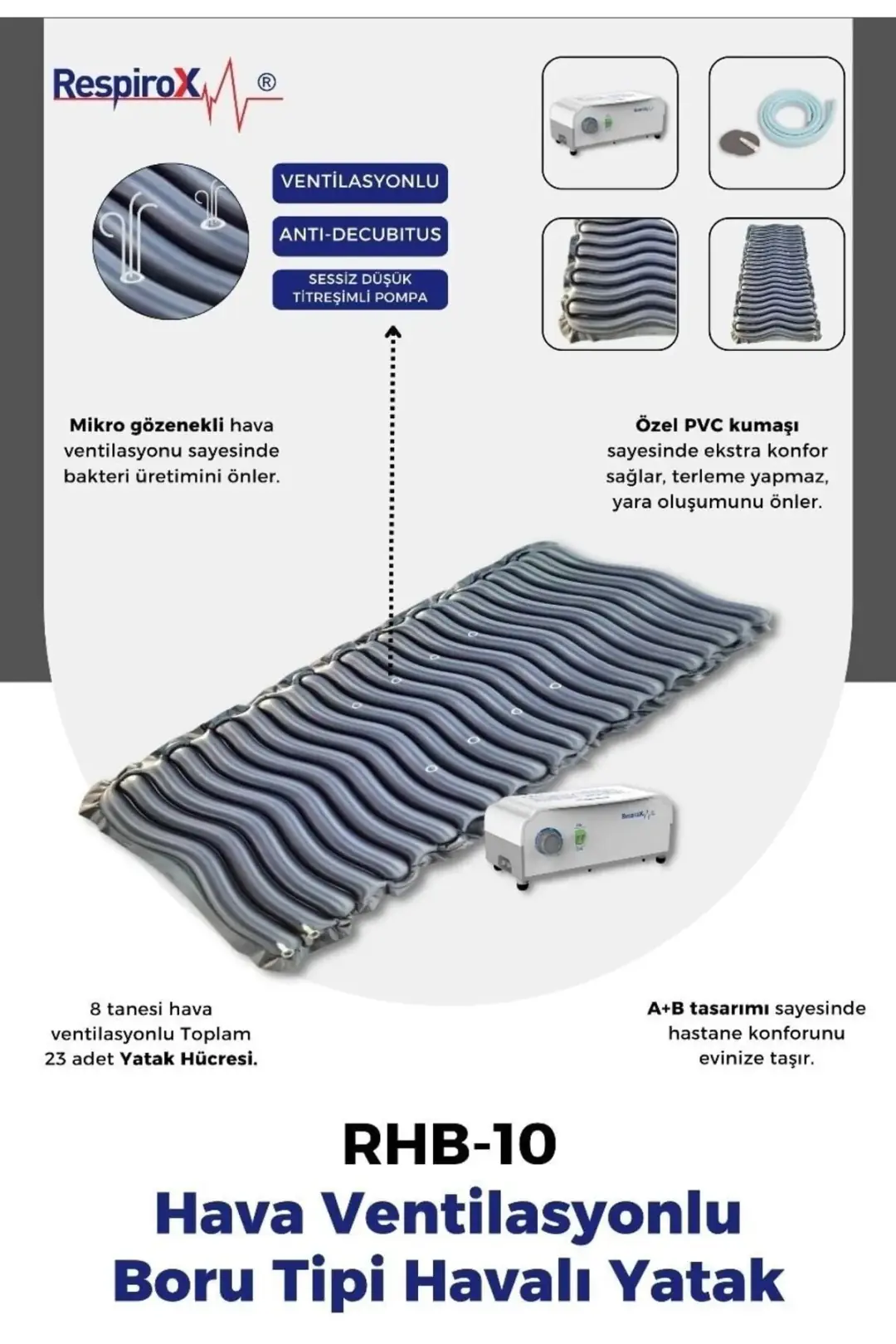 İçeriğe atlaHasta Yatakları ve Taşıma Liftleri, RespiroxRespirox RHB-10 Hava Ventilasyonlu Boru Tipi Havalı Yatak